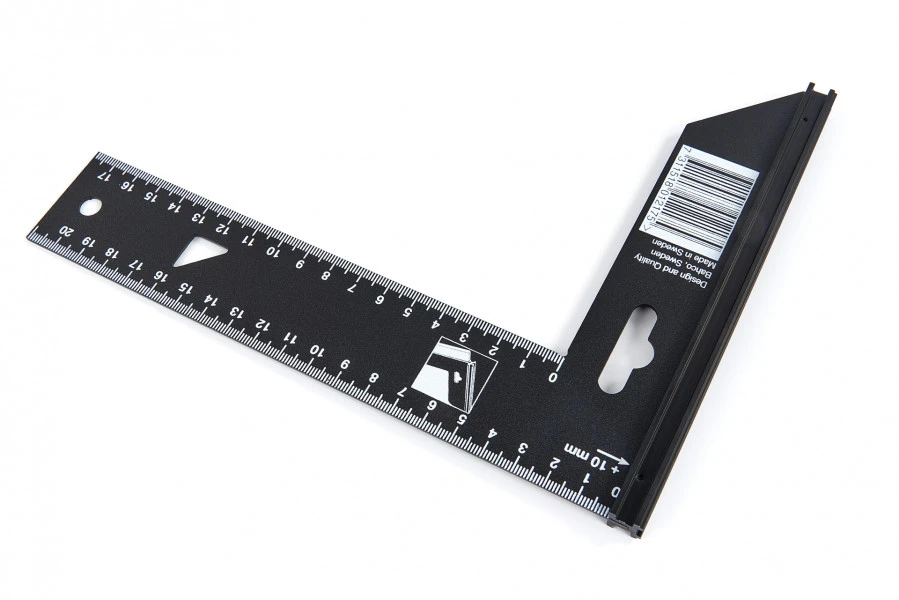 Uit één stuk gestanste schrijfhaken van Zweeds kwaliteitsstaal. Voor een nauwkeurige 90° hoek waarbij gemakkelijk 45° en 90° hoeken kunnen worden afgetekend. Door de opstaande rand onderaan de basis kan de winkelhaak stevig tegen het werkstuk worden gedrukt. Goed afleesbare schaal aan beide zijden. Uitvoering zwart, met roestwerende lak.