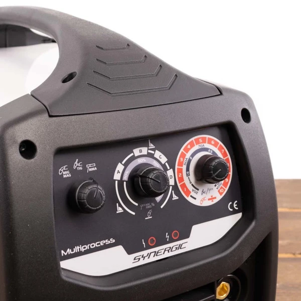 De Telwin Maxima 200 Synergic is een microprocessor gestuurde draadlasser en geschikt voor MIG-MAG, Flux, Brazing (hardsoldeer), TIG en MMA lassen op basis van invertertechnologie. De Maxima 200 Synergic is daarmee zeer breed inzetbaar. Dit lasapparaat kan lassen met MIG-MAG, FLUX (gevulde draad) en BRAZING (hardsoldeer) technieken en is daarmee dan ook geschikt voor vele lasmaterialen zoals staal, roestvrij staal en aluminium. Verder kunt u met dit lasapparaat dus ook gewoon met elektroden lassen met elektroden (DC) van 1,6 tot 3,2 mm. De Telwin Maxima 200 Synergic is een compacte en lichtgewicht lasmachine. Met zijn 11 kg gemakkelijk mee te nemen en met zijn compacte behuizing van 450 x 235 x 370 mm tevens gemakkelijk op te bergen. Aan de bovenkant van de machine is een stevig handvat aanwezig waaraan het lasapparaat gemakkelijk te dragen is.