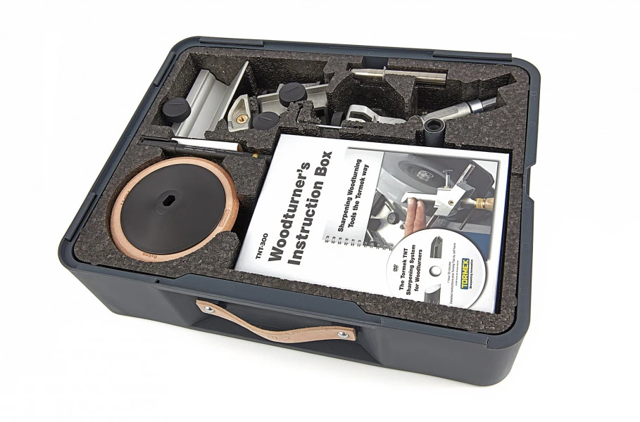 De Tormek TNT-8078 achtdelige slijphulpstukken accessoireset voor houtdraaiers bevat alles wat je nodig hebt om al je draaigereedschap te kunnen vormen en slijpen. De set wordt geleverd inclusief twee gepatenteerde slijpmallen, die als drie mallen werken. Verder ontvang je een afgeronde leren wetschijf, de hoek instelmal voor houtdraaibeitels en een uitgebreide instructie met DVD. Alle slijpmallen en accessoires kan je opbergen in de bijgeleverde stevige kunststof koffer met leren handgreep.